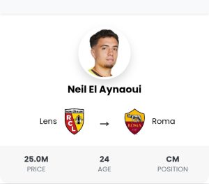 L’AS Roma a officiellement confirmé la signature du milieu de terrain marocain très prometteur Neil El Aynaoui en provenance du RC Lens. Ce transfert marque une fin émouvante pour le joueur au Stade Bollaert-Delelis. Le transfert a été finalisé après de longues négociations entre les deux clubs, pour un montant total de 25 millions d’euros, dont 23,5 millions d’euros d’avance et 1,5 million d’euros supplémentaires de primes de performance.