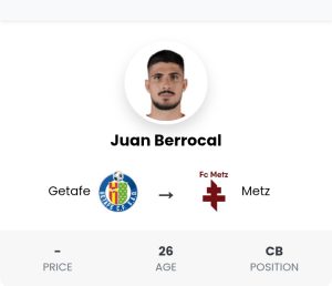 Juan Berrocal a été la recrue la plus chère de Getafe lors du dernier mercato, après avoir été acheté à Eibar pour un montant estimé à 2,2 millions d’euros. Cependant, sa valeur marchande actuelle, telle que publiée par Transfermarkt, s’élève à 1,5 million d’euros. Ce transfert à Metz marque le premier transfert international de la carrière de Berrocal après avoir passé sa carrière professionnelle en Espagne, notamment à Séville, au CD Mirandés, au Sporting Gijón, à Eibar et, plus récemment, à Getafe.